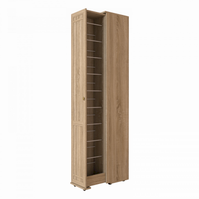 Высокая и узкая обувница - уникальное предложение на рынке мебели. Узкий (300 мм), но высокий (2125 мм) он вмещает до 18 пар обуви, а также средства по уходу за ней. Предусмотрены варианты перестановки стальных прутков-держателей для хранения маленькой детской обуви. Для этого в 2-х верхних и 2-х нижних рядах предусмотрена дополнительная присадка в центре для переноса стальных прутков ближе друг к другу. Шкаф выдвигается без усилий благодаря шариковым направляющим полного выдвижения и выкатным роликам.