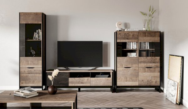 Оригинальная функциональная стенка Стокгольм впишется в любое современное пространство гостиной в квартире или загородном доме. Особенность дизайна – это сочетание реалистичных по цвету и тактильности трендовых декоров, которые соответствуют последним городским тенденциям. «Дуб Гранж» привлекает песочным оттенком и имитацией вручную обработанного дерева с выразительной зернистой текстурой, характерной формой досок. Стильный серый цвет «Железного камня» с металлическими разводами и новая текстура состаренной штукатурки в сочетании с гладкостью металла вносят индустриальный колорит. Оригинальные ножки-опоры из контрастного профиля МДФ, расположенные по бокам модулей, имитируют металл и подчеркивают стиль коллекции. Витрины из стекла создают ощущение свежести, легкости и чистоты.