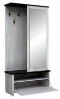 Шкаф разделен на 3 отделения: отделение с крючками для навешивания одежды, отделение со стационарной металлической штангой для одежды и отделение с полкой за откидной дверью
