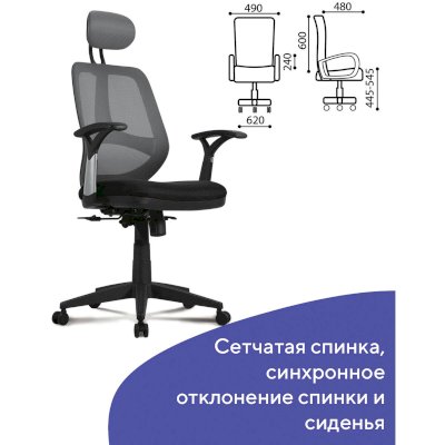 Система качания - "синхромеханизм". Эта система считается наиболее технически совершенной и самой эргономичной. Синхромеханизм позволяет согласованно изменять углы наклона одновременно и спинки кресла, и сиденья. Оптимальной «эргономической» пропорцией при синхронном изменении углов наклона спинки и сиденья кресла считается соотношение 3:1, при котором наклону спинки на 3 градуса соответствует наклон сиденья на 1 градус. У данной модели используется именно такое соотношение. Все cинхромеханизмы обязательно оснащаются регулировкой нагрузки для настройки по весу пользователя.