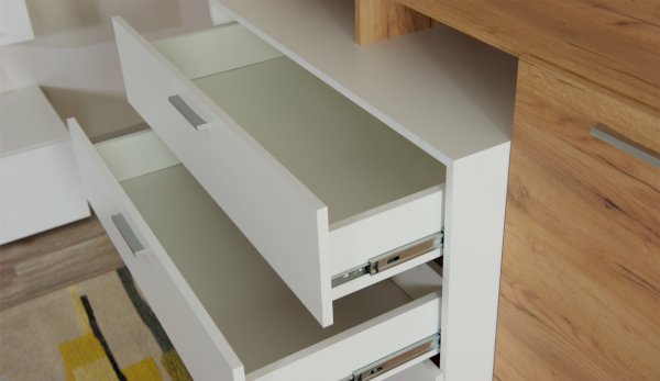 Оригинальный комод Невио – 1 станет незаменимым предметом интерьера в Вашем доме. Яркое сочетание белого цвета с теплым древесным позволит сочетать его с другими предметами мебели и декора, создавать яркие и разнообразные интерьеры. Комод оснащен вместительными ящиками полного выдвижения, открытыми и закрытыми полками. Верхняя крышка комода увеличена на 1 см, что обеспечивает эстетичный вид сверху. Мебель выполнена из высококачественных экологичных материалов