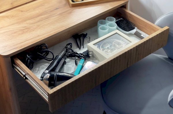 Трюмо Адам — это идеальное сочетание стиля и практичности. С широким фацетированным зеркалом, в котором встроена подсветка из 6 лампочек, оно создает атмосферу профессиональных студий визажистов прямо у вас дома. Комфорт и функциональность обеспечиваются дополнительными элементами, такими как выключатель, розетка для фена и выдвижной ящик для хранения украшений и косметики. Элегантные закругленные углы завершают дизайн, делая его идеальным дополнением к вашей спальне.