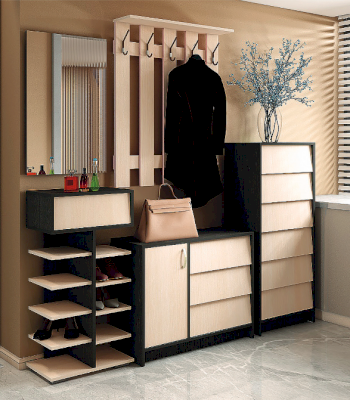 Интро - это целая серия мебели, с помощью которой вы можете обустроить прихожую. В серии представлены обувницы разных размеров с откидными створками, шкаф, зеркало, вешалки.