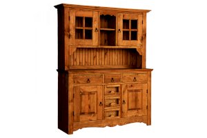 Буфет из массива сосны ENSEMBLE 150. Широкий буфет оценят и любители оригинальных интерьеров, и практичные хозяева. Комплект из нижней тумбы и верхнего буфета выполнен в стиле Прованс. За стеклянными дверцами можно хранить праздничные сервизы, семейные раритеты, интерьерные вещицы.  Задние стенки всех буфетов набраны из дощечек массива сосны. Также из массива сосны набраны днища ящиков. В конструкции нет элементов из фанеры, ДСП, или МДФ.