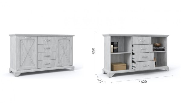 Наполнение: 4 выдвижных ящика + 2 шкафчика с распашными дверцами (внутри по 1 полке)