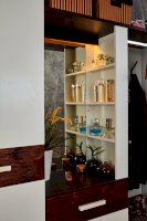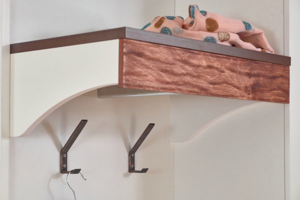 Шкаф МЦН 70 Норвуд включает множество элементов: крючки, стационарная штанга, открытые полки, выдвижные ящики, отделение за откидным фасадом, открытая ниша, зеркало с подсветкой. Встроенная светодиодная подсветка включается при помощи аккуратного кнопочного выключателя.
