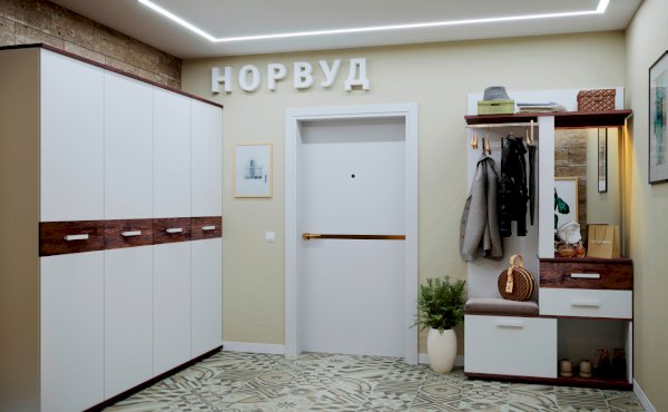 В прихожей Норвуд Белый декор используется в качестве основного цвета. При этом помещение не будет выглядеть просто, так как в дизайне модулей Норвуд используются контрастные горизонтальные поверхности и брашированные деревянные вставки в декоре Орех Шоколадный. Выразительное сочетание актуальных декоров не останется незамеченным и привнесет теплоту в атмосферу вашего дома.