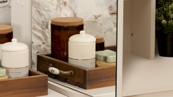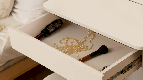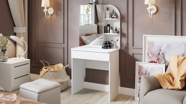Несмотря на свои компактные размеры, туалетный стол имеет функциональный ящик с шариковыми направляющими для хранения парфюмерии, достаточно вместительную столешницу, где можно разместить все необходимые аксессуары и полноценное зеркало, которое имеет дополнительное место с полками для хранения за дверцей.