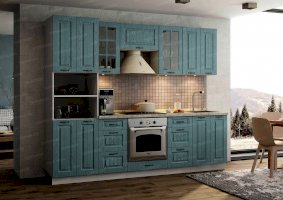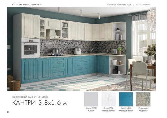 Ослепительная чистота и свежеть царят на кухне, обставленной мебелью из гарнитура «Кантри». Особую атмосферу создает отделка бирюзового, голубого, сиреневого цветов. Простой дизайн и хорошо различимая текстура натуральной древесины придает интерьеру деревенскую стилистку. Для изготовления комплекта использованы качественные и экологичные материалы.