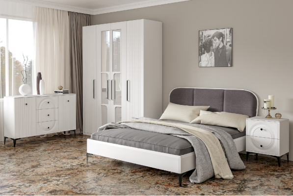 Основным декоративным элементом коллекции является круг. Явно представленный фрезеровкой по фасадам тумбы, комода, в изголовье кровати и ручках-кнопках.