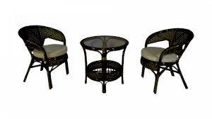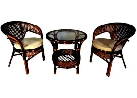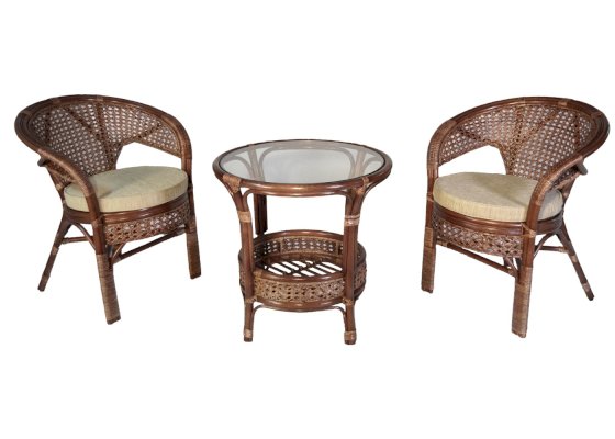 Комплект мебели Пеланги 02/15 включает в себя: 2 кресла и столик с красивым плетением снизу и полочкой, съемные подушки из материала улучшенного качества.