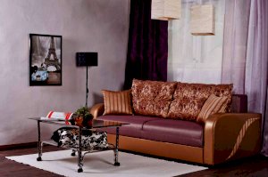 Именно эта модель была отмечена большинством посетителей как самый стильный и оригинальный дизайн. Необычная декоративная вставка на боковине делает этот диван ярким и запоминающимся, а механизм «еврокнижка» превращает диван в полноценную кровать. По желанию клиента диван комплектуется креслом «Сидней».