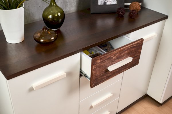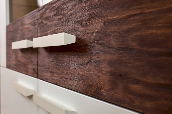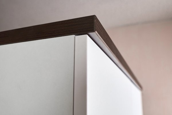 Основной декор гостиной НОРВУД — белый. Именно он отвечает за визуальное расширение пространства и освещение. Контрастные горизонтальные поверхности толщиной 22 мм в декоре Орех Шоколадный разбавляют белые фасады модулей.