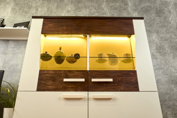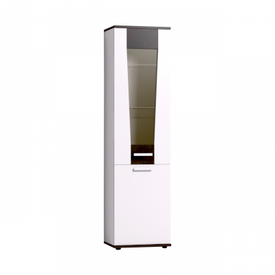 Фигурный фасад витрины модуля Норвуд 22 Шкаф-сервант эффектно совмещает в себе стекло, ЛДСП и брашированную деревянную вставку. Тонированные стекла фасадов прекрасно подчеркивают материал брашированных вставок.
