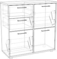 Тумба для прихожей имеет  2 отделения под обувь оснащенными обувными механизмами, два выдвижных ящика и нишу за закрытой дверкой для обуви или различных вещей.