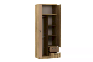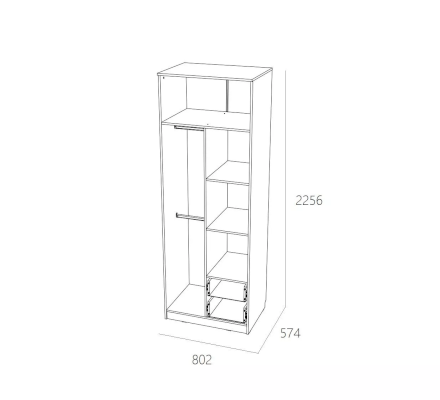 Отделение с 2-мя штангами позволит удобно развесить большое количество одежды на вешалках. Наличие полок позволит рассортировать одежду и поставить коробки. Два выдвижных ящика предназначены для сложенной одежды, аксессуаров, личных вещей.