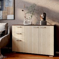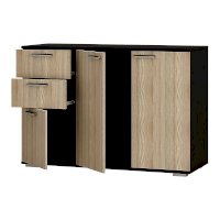 Комод Стандарт №3 шириной 1200 мм имеет необычное размещение полок и ящиков. Основная часть изделия состоит из двух распашных дверок, за которыми находятся места для хранения вещей. Левая часть комода представляет собой два выдвижных ящика и нижнюю секцию также с распашной дверцей и полками.