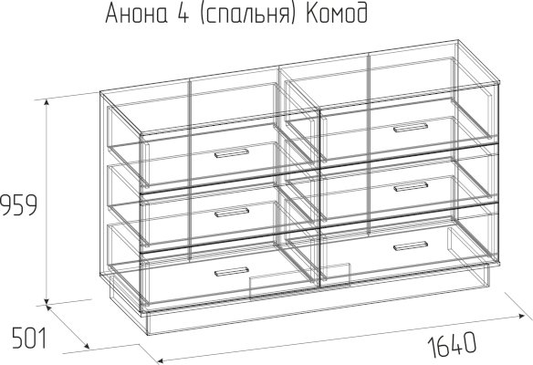 Вместительный Комод АНОНА 4 с широкой столешницей и с шестью выдвижными ящиками на шариковых направляющих подойдёт даже для размещения телевизора в спальне. Декоративные вставки и ручки из массива дерева - главные акценты дизайна комода.