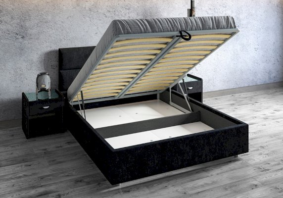 Лаконичная модель с изголовьем из объемных прямоугольников, сшитых между собой. Царги кровати выполняются по технологии съемного чехла. Модель изготовлена из ДСП. Обратная сторона изголовья обита спандбондом, но, при желании, её можно выполнить из основного обивочного материала. В комплект кровати входит кроватное основание. Каркас основания выполнен из металла, ламели - из берёзы. При необходимости в комплект кровати можно включить подъемный механизм с бельевым ящиком, который существенно увеличит объем хранения вещей, а так же позволит легко производить уборку пыли под кроватью.