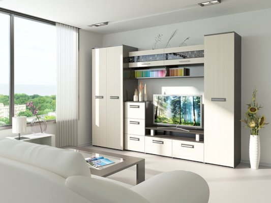 Стенка Мечта - прекрасное решение для гостиной. Сочетает в себе различные по функциональности модули, а декор из стекла добавляет контраст и оригинальность.