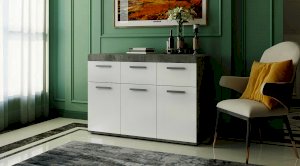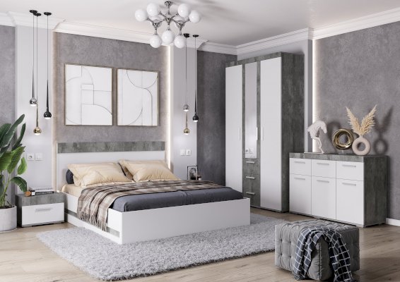 Светлые матовые фасады, стильный корпус в цвете бетон, лаконичные хромированные ручки – все это про модель комода Инстайл из одноимённой мебельной коллекции. Размеры комода позволяют разместить в нем большое количество вещей. В верхних выдвижных ящиках можно хранить украшения или аксессуары.