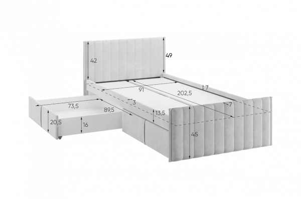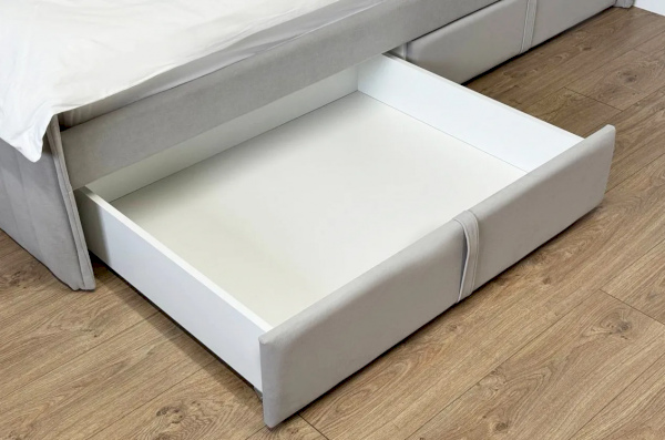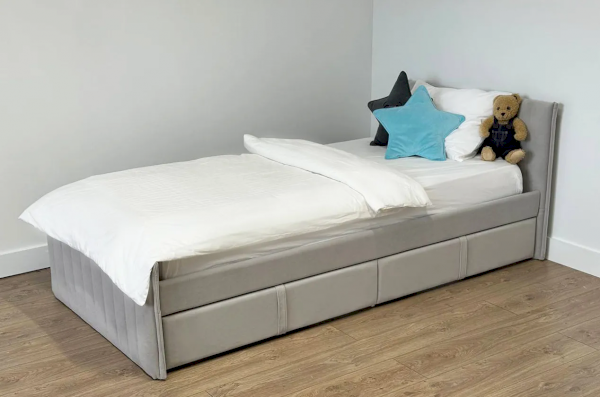 Мягкое изголовье обеспечивает дополнительную поддержку для спины во время чтения или отдыха. А мягкие корпус и фасады ящиков, обтянутые высококачественным велюром, создают уютную атмосферу и дополнительную безопасность Кровать оснащена удобными выкатными ящиками на роликах высотой Н30, что позволяет легко хранить игрушки, постельное белье или другие вещи, сохраняя порядок в комнате. Армированное основание из ЛДСП обеспечивает надежную поддержку матраса и гарантирует удобный сон.