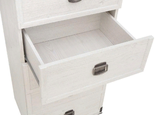 Шкаф разделен на 2 отделения: верхнее –открытое отделение с полками, нижнее – 4 выдвижных ящика на металлических роликовых направляющих