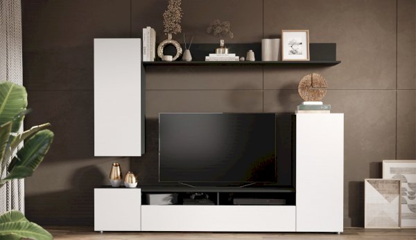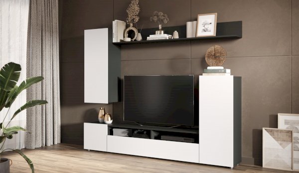 Мини-стенка «Нео» — современное, функциональное решение для гостиной, поможет рационально обустроить комфортную зону для отдыха и просмотра TV. Большая ниша для телевизора, закрытые шкафчики и открытые полки вместят в себя всё самое необходимое. Гармоничное сочетание популярных цветов декора корпуса и фасадов подчеркивает простые и легкие геометрические формы стенки, расширяет пространство, добавляет света и воздуха.