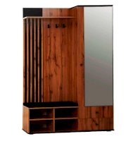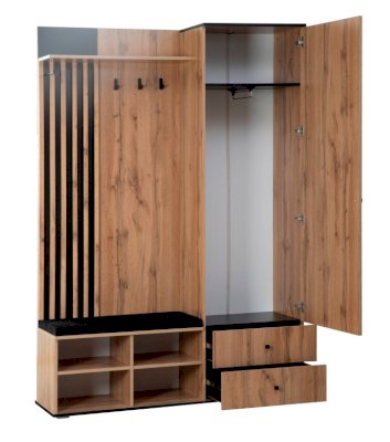 В шкафу есть открытая секция с тремя металлическими крючками, чтобы повесить верхнюю одежду. Ниже предусмотрен мягкий элемент, чтобы можно было присесть и снять обувь или просто поставить сумку. В закрытой секции - выдвижная штанга и шляпная полка. Выдвижная штанга выдерживает вес до 16 кг. Снизу предусмотрены два вместительных выдвижных ящика с шариковыми направляющими. Ящики можно использовать для хранения обуви и обувных аксессуаров.