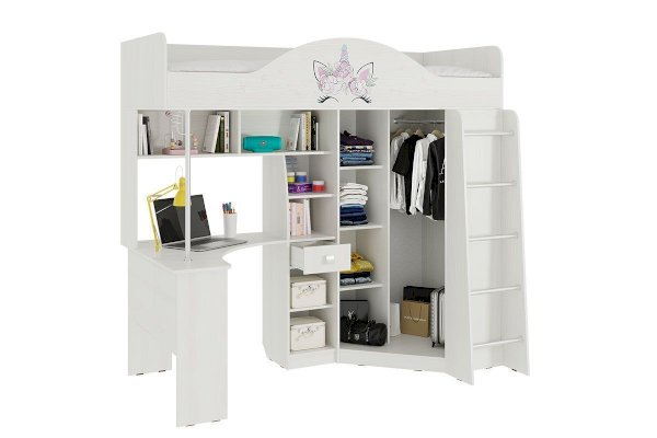 Состоит из: шкафа для одежды, стола, выдвижного ящика, шкафа с полкой, спального места, полок.